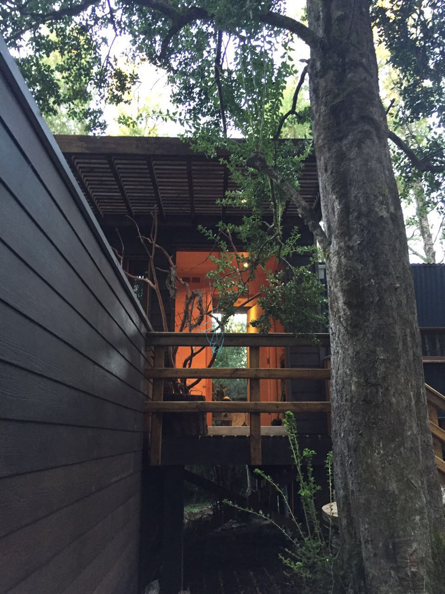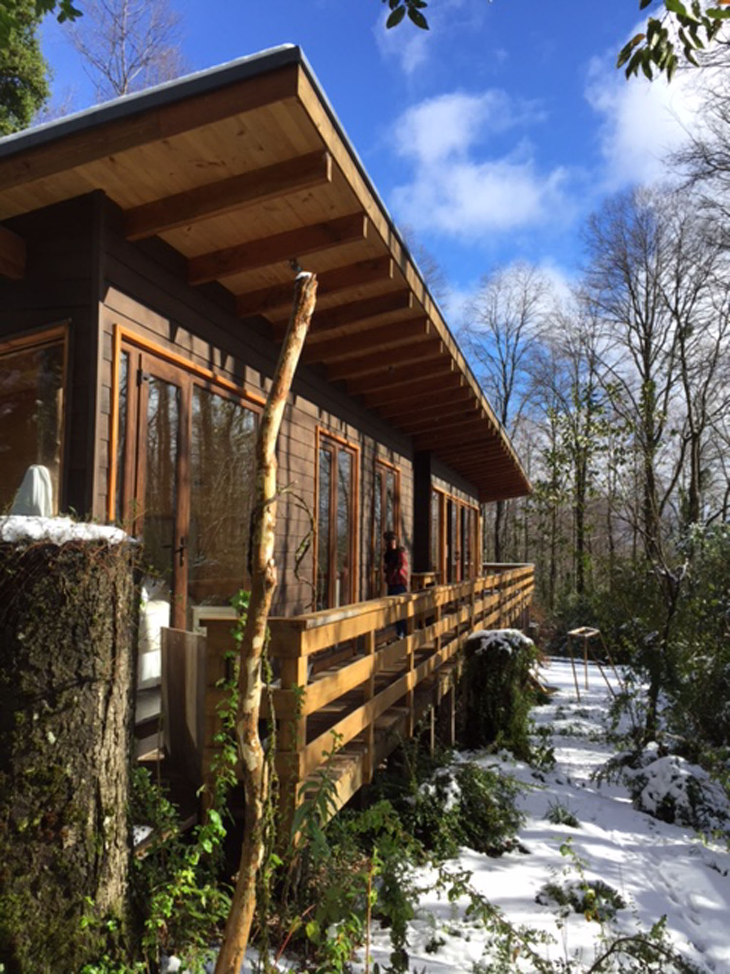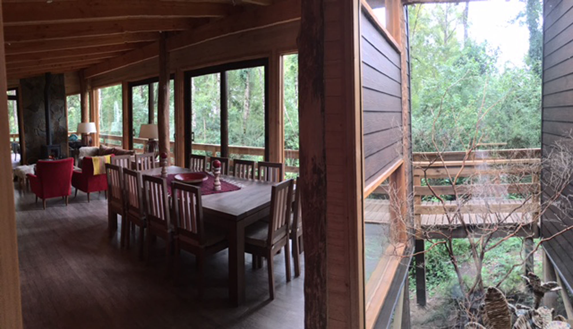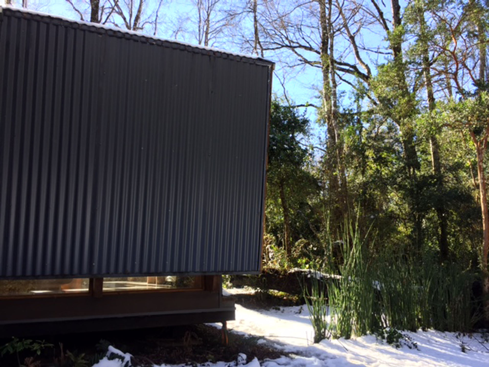 Emplazada en medio de un bosque nativo, esta vivienda se desarrolla linealmente despegándose del terreno en pendiente existente en el lugar, haciendo de su recorrido una experiencia de vistas de los diferentes niveles de altura del bosque, pasanso por los dormitorios a nivel de la base de los árboles, hasta la zona de living-comedor-terraza, la cual mira el paisaje a la lejanía como también el follaje alto de los árboles del entorno. El concepto espacial de toda la obra se basa en una corteza que cobija a sus habitantes, cerrándose hacia su fachada sur y abriéndose hacia su fachada norte, integrando de manera contínua la cubierta con el muro y un asiento en obra que se repiten en diferentes sectores del recorrido. Esta corteza en extensión se despega del piso, exacerbando la sensación de flotar en todos los elementos de la composición. Construída sobre pilotes de madera nativa, esta casa mezcla acero y madera en su estructura.