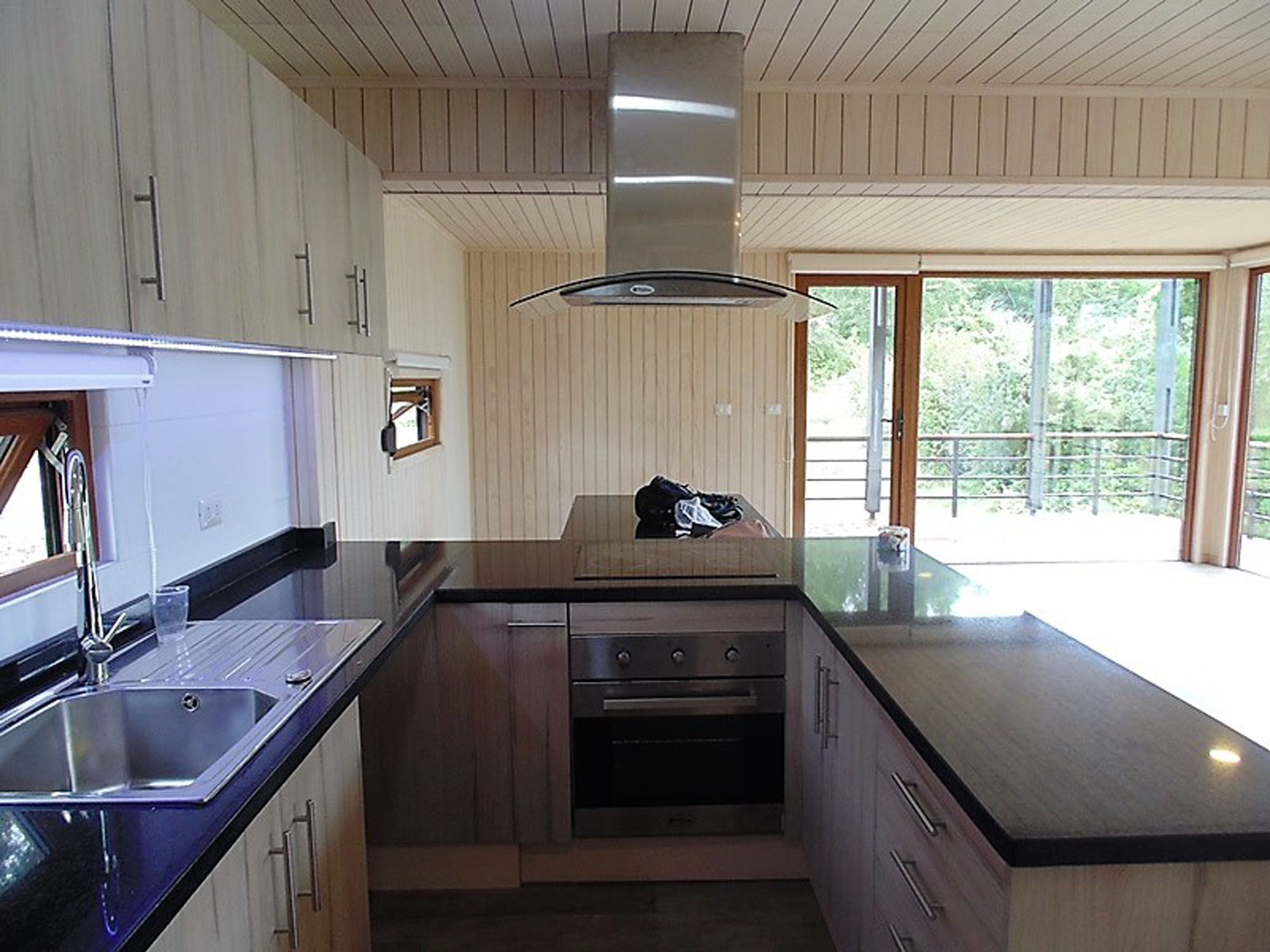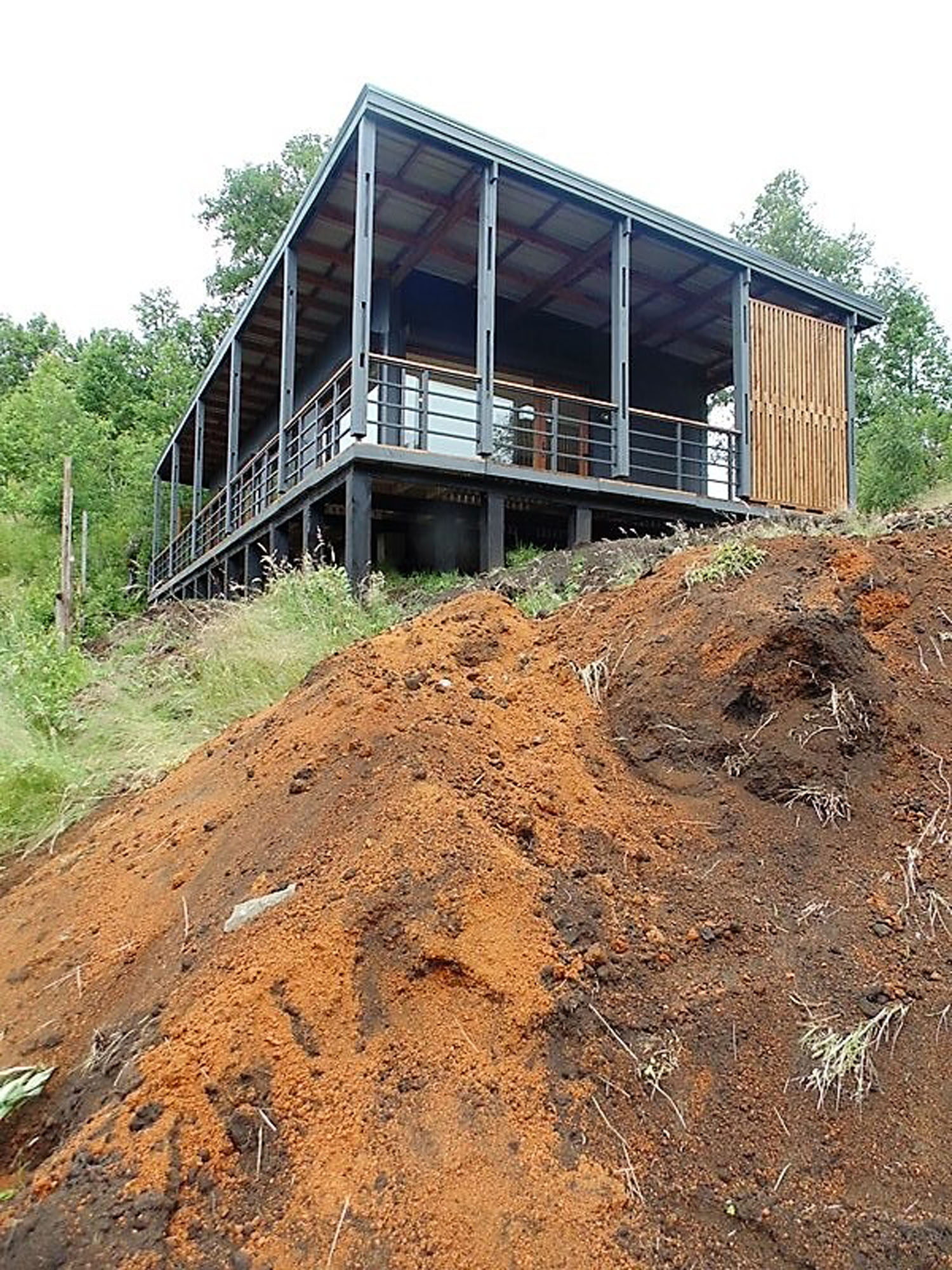 Este prototipo de vivienda modular sustentable se diseñó como segunda vivienda para disfrutar del paisaje del lago calafquén y el volcán Llaima. Su construcción industrial, en base a módulos prefabricados, incorporó estructura metálica, paneles SIP y madera acerrada, todas piezas y partes que conformaron los módulos para luego ser emplazados y unidos en el lugar, previa fabricación in situ de pilotes de hormigón armado. Es una obra de alta eficiencia térmica la cual incorporó envolvente térmica continua, ventanas termopanel con marcos de PVC folio madera y corredores perimetrales en sus fachadas norte y poniente, controlando la lluvia y el excesivo sol en verano. El tiempo de construcción en el terreno se redujo a la mitad del tiempo de una obra tradicional, lo cual redujo considerablemente los impactos medioambientales en el lugar.